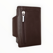 Този портфейл предлага надеждна RFID защита за безконтактни карти, което предотвратява възможни кражби и клониране на данни. Снабден с механизъм за лесно изваждане на картите чрез натискане с палец, той гарантира, че картите няма да изпаднат случайно. Изработен е от висококачествена синтетична кожа което го прави чудесен избор за подарък. Портфейлът разполага с множество отделения за карти, лични документи, монети (външен джоб с цип) и банкноти, като остава компактен и удобен за носене в различни джобове.